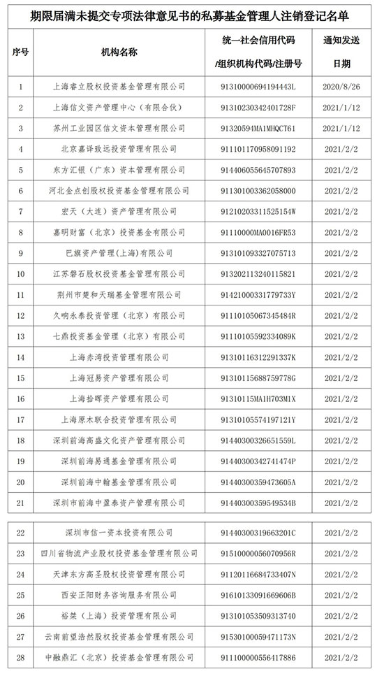 同时,基金业协会依据《关于私募基金管理人在异常经营情形下提交专项法律意见书的公告》,针对上海睿立股权投资基金管理有限公司等28家私募基金管理人存在的异常经营情形,且未能在书面通知发出后的3个月内提交符合规定的专项法律意见书,协会将注销该28家机构的私募基金管理人登记,并将上述情形录入资本市场诚信档案数据库。