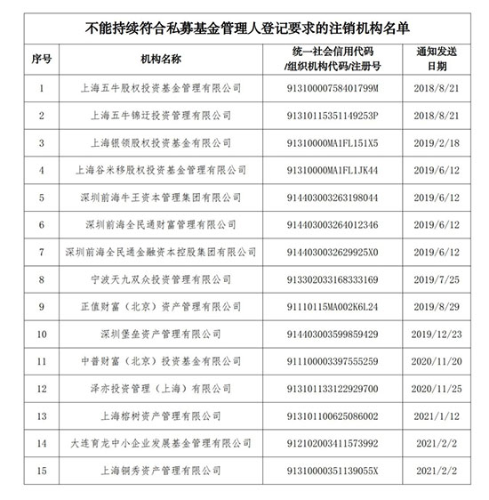 基金业协会表示,根据《关于私募基金管理人在异常经营情形下提交专项法律意见书的公告》相关规定,上海五牛股权投资基金管理有限公司等15家管理人不能持续符合管理人登记要求。协会将注销该15家机构的私募基金管理人登记,并将上述情形录入资本市场诚信档案数据库。