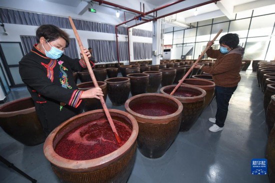 11月12日,在龙峰民族村的一家红曲酒厂内,红曲酒技艺传承人陈凤凤(左)在进行酒料搅拌发酵。