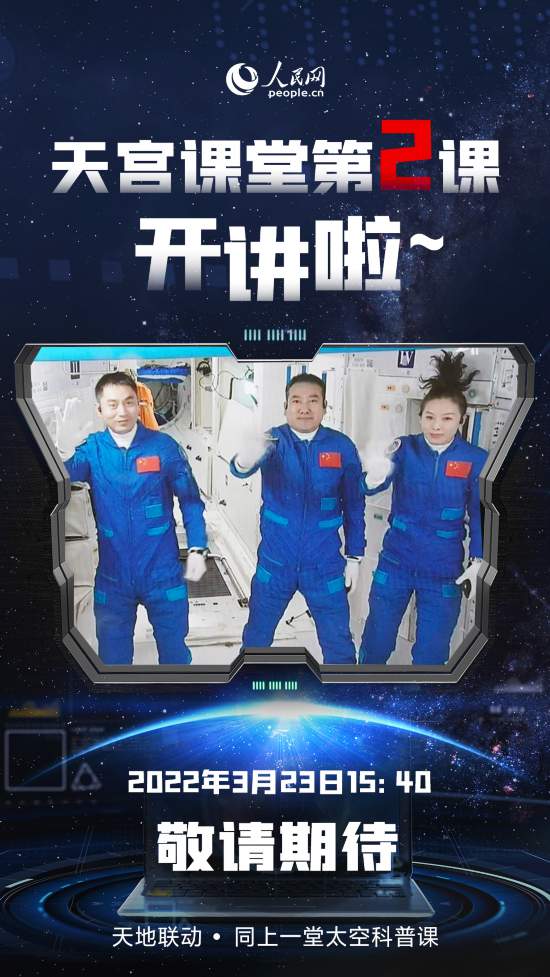人民网北京3月23日电 (记者赵竹青)据中国载人航天工程办公室消息,“天宫课堂”将于今天(23日)15时40分在中国空间站开讲,神舟十三号乘组航天员翟志刚、王亚平、叶光富将相互配合进行授课。这是中国空间站的第二次太空授课。